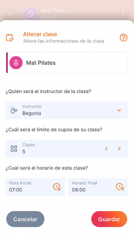 3. Cambia la información deseada: instructor, cantidad de cupos, hora de inicio y hora de fin de la clase.