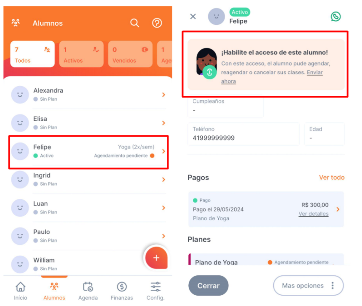 ¡Recuerda que el teléfono de tu alumno debe estar registrado correctamente en la aplicación para que puedas realizar este envío!