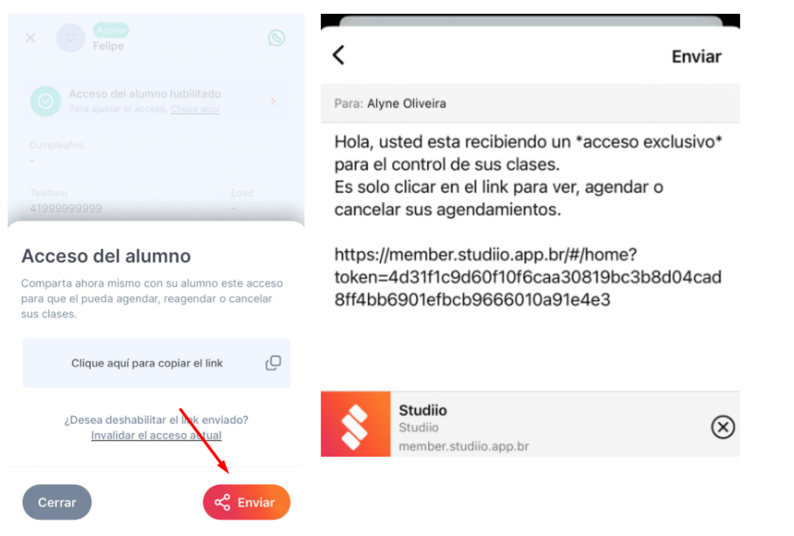 5. Revisa el mensaje preestablecido de la aplicación Studiio y envíalo a tu alumno.