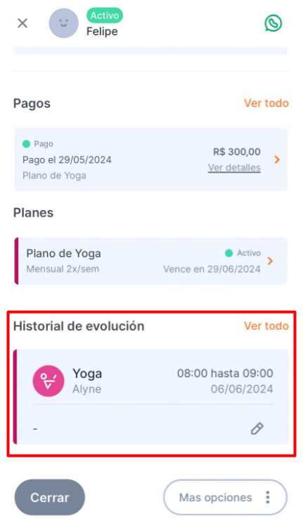 Habrá un área presentando la última evolución del alumno registrada.
