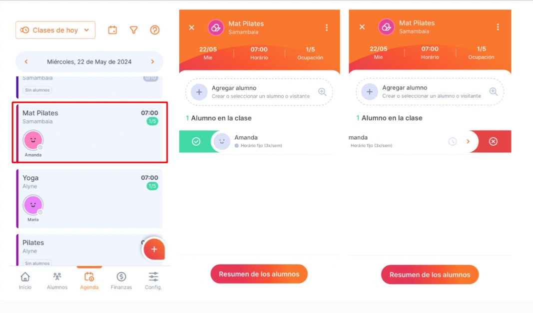 4. O, toca en el alumno para marcar presencia, ausencia o reprogramar su clase.