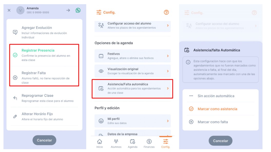 - Configura para dar ausencias o asistencias automáticas: haz que los agendamientos que no fueron marcados como asistencia o ausencia, al final del día, se marquen automáticamente como una de las dos opciones. Para esto, accede a Ajustes > Opciones de Agenda > Asistencia/Ausencia automática.