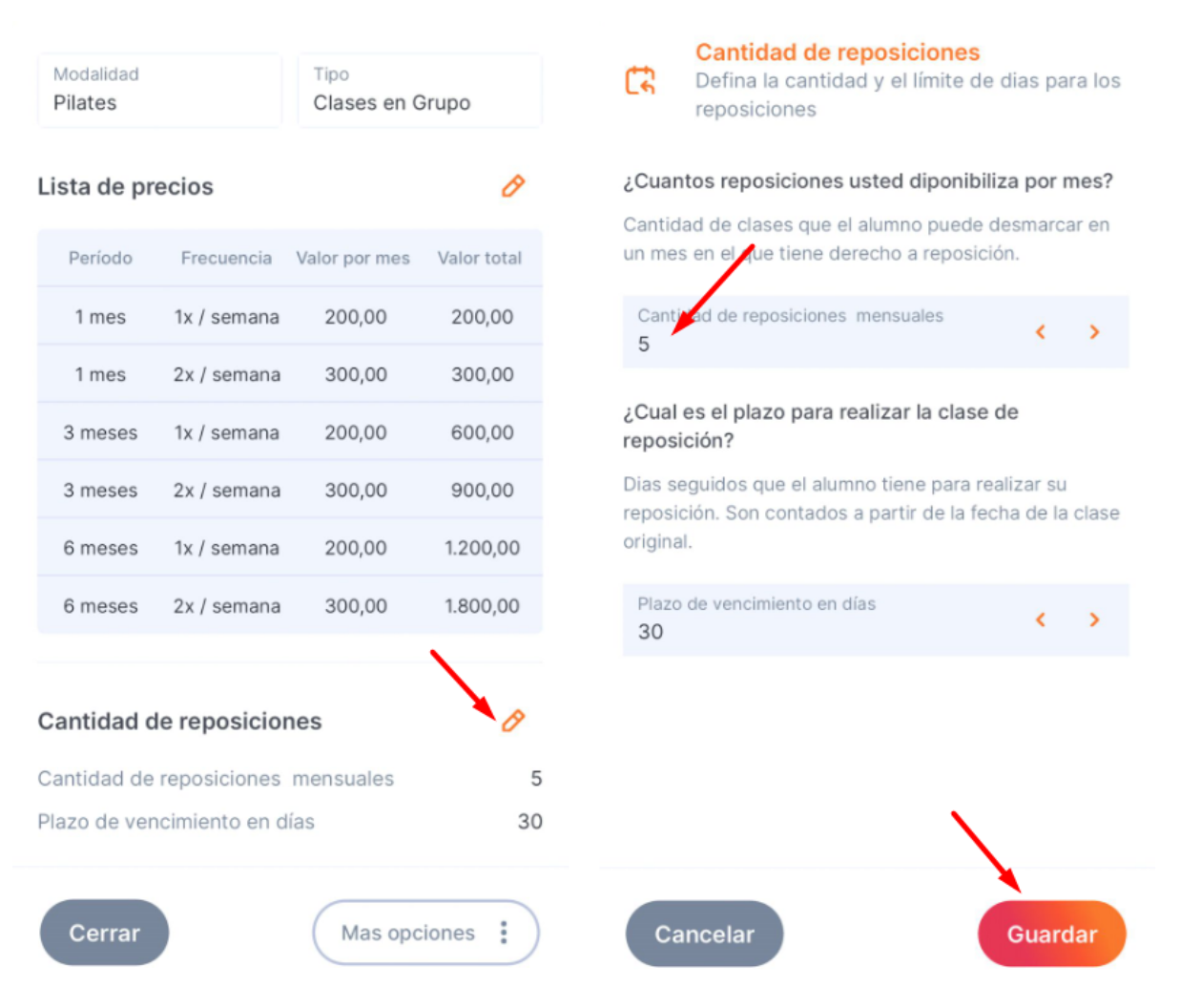 5. Edite la cantidad de reposiciones que el alumno tendrá por mes y el plazo para realizar la reposición.