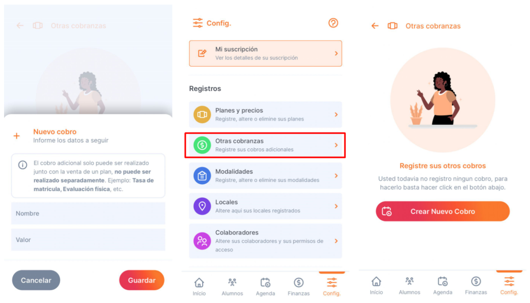 Al hacer la venta de un plan para su alumno, puede aplicar descuentos o cobranzas adicionales (cuota de matrícula, evaluación física, etc.)
