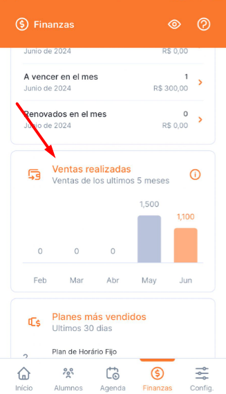 Menu "Finanzas" Ventas realizadas > Toque en el gráfico para ver los detalles de los valores recibidos.