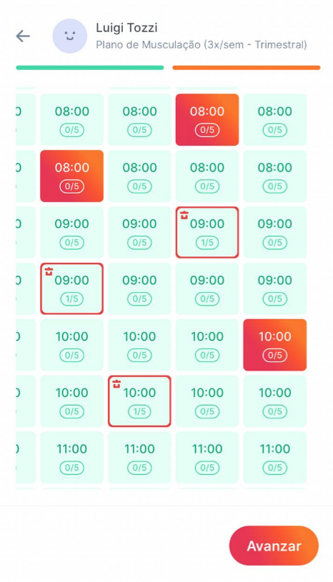 5. Deselecciona el horario que necesita ser cambiado (en color rojo) y selecciona el nuevo horario deseado y disponible (en color verde) y luego haz clic en "Siguiente".