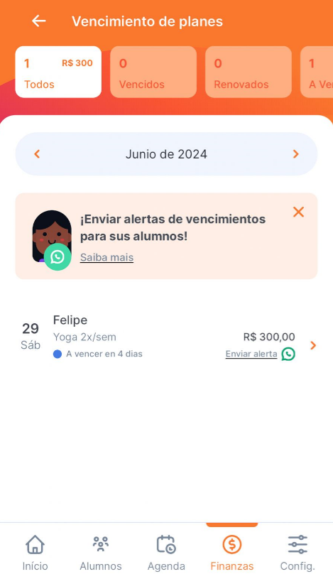 Ese botón abrirá el WhatsApp del alumno con un mensaje ya preparado, indicando la fecha de pago y el valor de la mensualidad. En ese punto, ¡solo tienes que enviar el mensaje!
