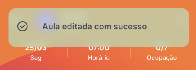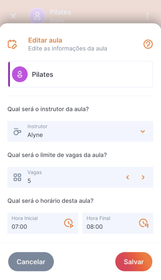 4. Altere informações desejadas: instrutor, quantidade de vagas, horário inicial e horário final da aula