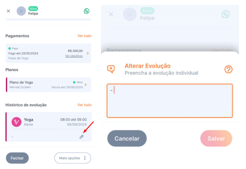 Leia mais sobre evolução do aluno no artigo: Como adicionar uma evolução para um aluno.