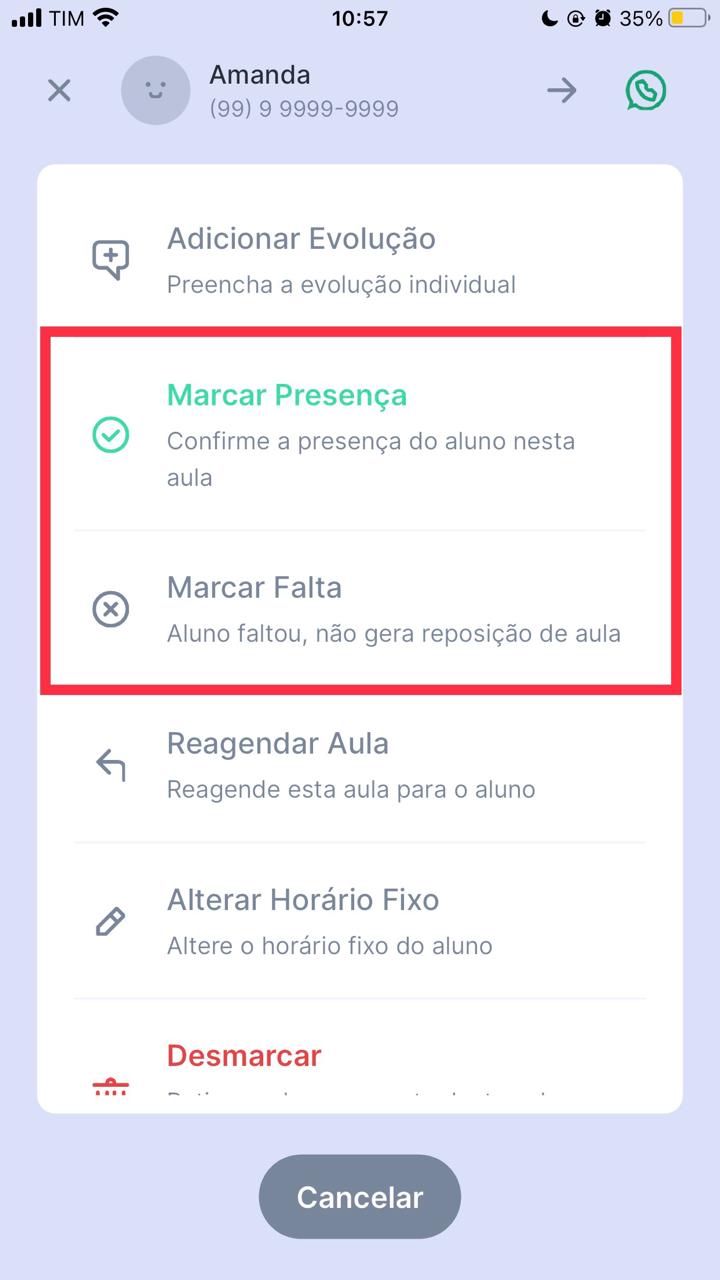5. Ou, toque no nome do aluno, e selecione "Marcar presença" ou "Marcar falta"