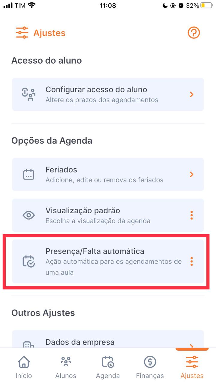 1. Acesse o menu Ajustes > Opções de agenda > Presença / Falta automática