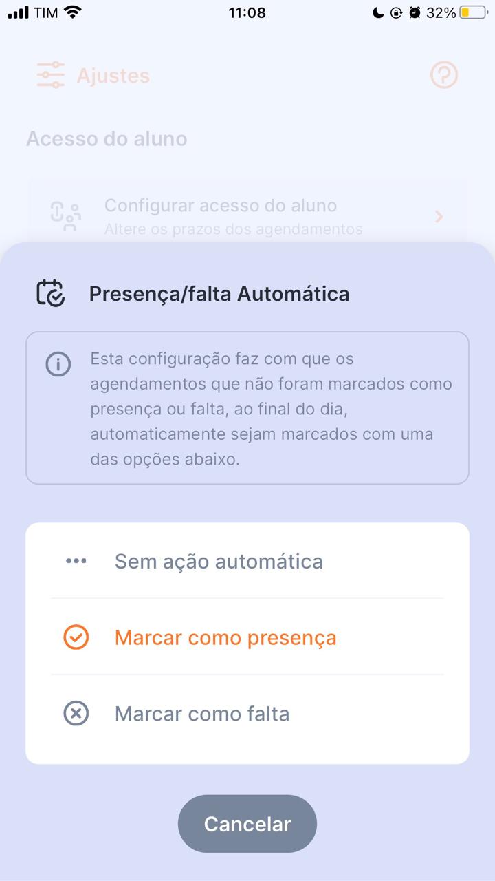 Ao selecionar uma das opções, os agendamentos que não foram marcados como presença ou falta, ao final do dia, serão automaticamente marcados com uma das opções (a qual você configurar).