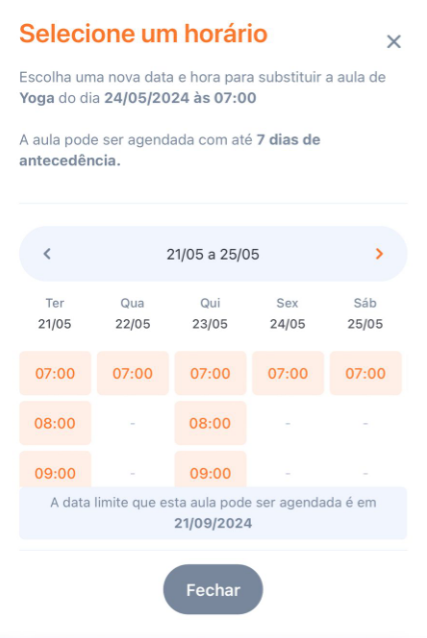 Plano de Horário Fixo é o formato de plano onde será realizado um agendamento semanal do aluno em dias e horários fixos na semana. Por exemplo: Pilates 2x na semana - toda terça às 18h e quinta às 19h.
