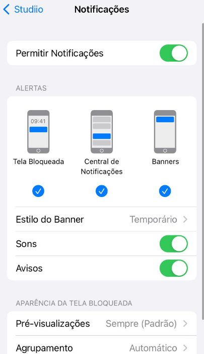 Configurações > Notificações > Busque pelo app Studiio > Ative as notificações no botão